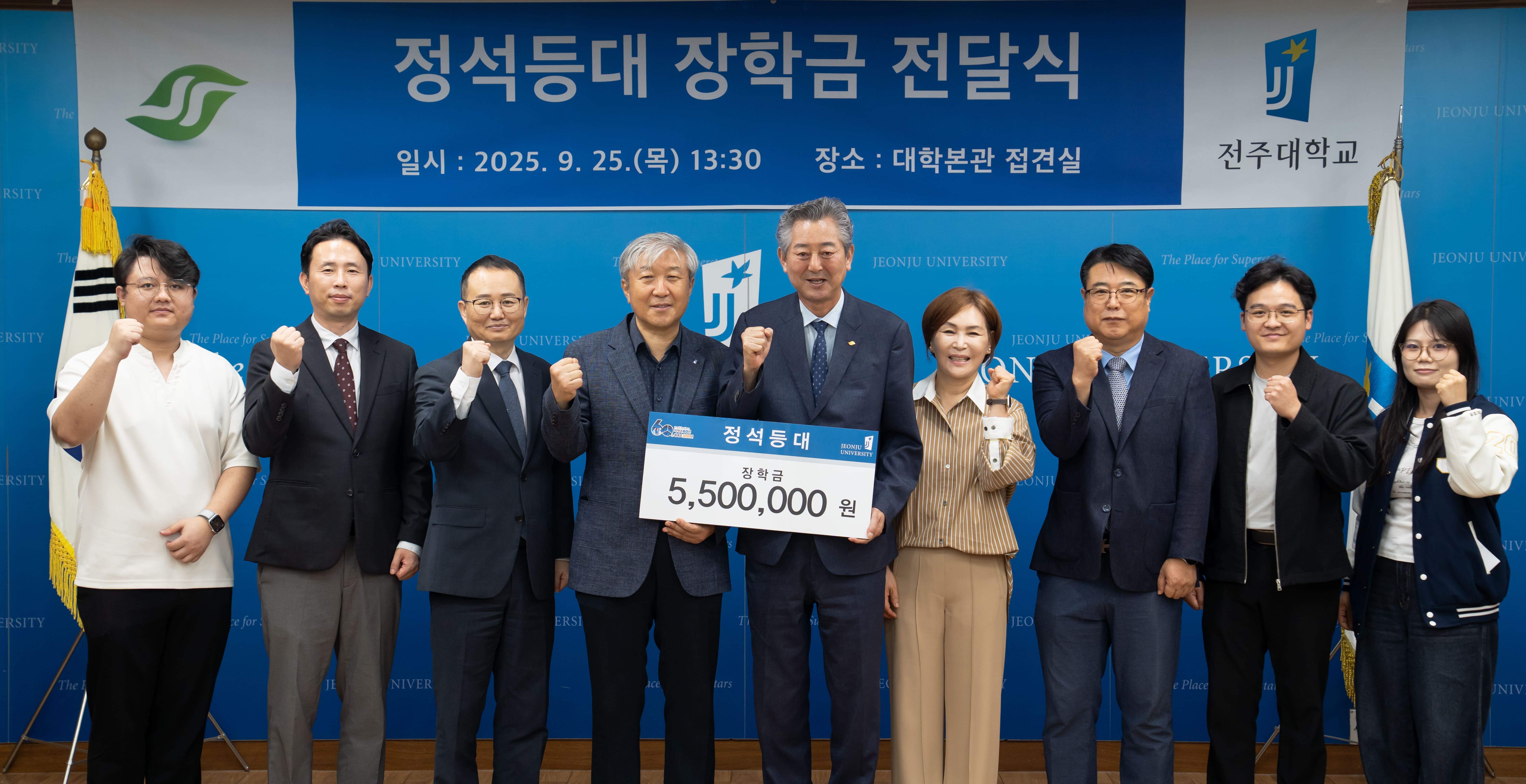 전주대학교(총장직무대행 권수태)는 25일 대학본관 접견실에서 (사)정석등대(이사장 김용현)로부터 총 550만 원의 장학금을 전달받았다고 밝혔다. 이번 장학금은 외국인 유학생에게 300만 원, 내국인 재학생에게 250만 원이 지원될 예정이다.